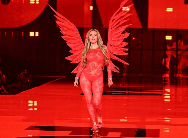 El punto culminante de su participación fue cuando la cantante regresó a la pasarela luciendo unas majestuosas alas rojas de encaje y diseño angular. Este accesorio, reservado para los ‘Ángeles’ de la firma, la coronó de manera simbólica, aludiendo a la fuerza de dragón y el fuego interior que la caracteriza. Este momento fue especialmente significativo, pues por primera vez una artista colombiana y de reggaetón protagoniza el desfile con una presencia tan destacada.